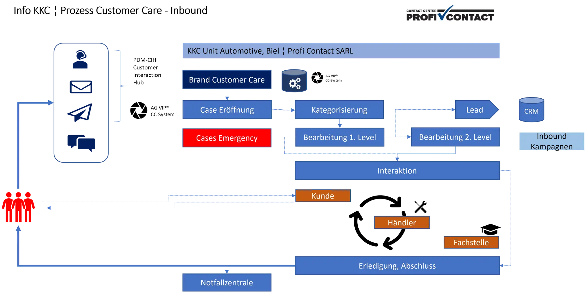 Mit unserer KKC Unit bieten wir Ihnen als Outsourcing Partner die kompletten Services für die Kundenbetreuung. Das Inbound Management umfasst alle von Ihnen definierten Kanäle und Bearbeitungslevels. Je nach strategischer Vorgabe führen wir die Kundenbearbeitungen im 1. Level, 2. Level bis hin zu Fachstellen Management aus. Unter 1. Level versteht man die schnelle und umgehende Case-Bearbeitung wie einfache Beantwortungen, Abklärungen und Weiterleitungen. Der 2. Level verfügt über weitergehende Skills und ist befähigt spezifische Bearbeitungen - je nach Ausbildungsstufe - auszuführen. Bei bestimmten Kunden haben wir sogar Fachstellenniveau und sind auf bestimmte Themen trainiert und bieten so einen umfassenden Service über den gesamten Kundenprozess.